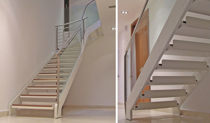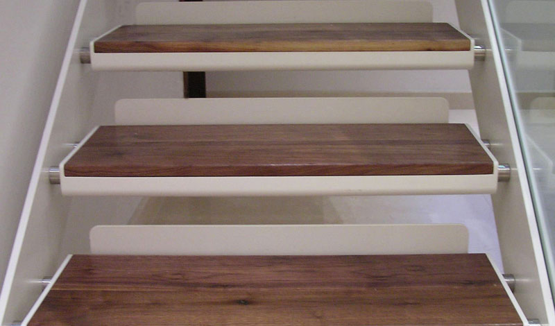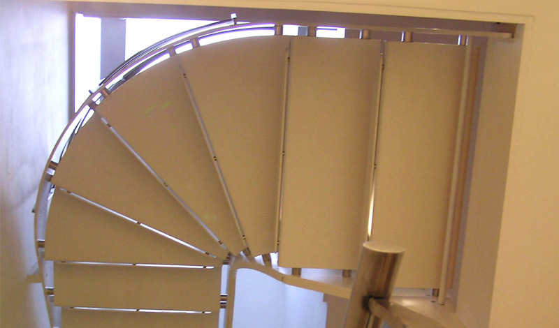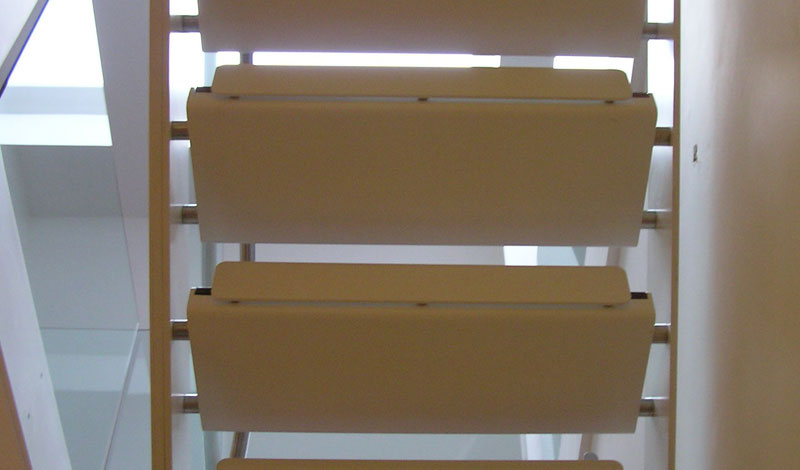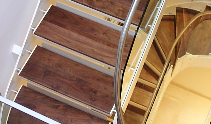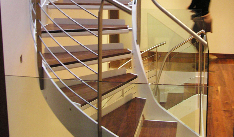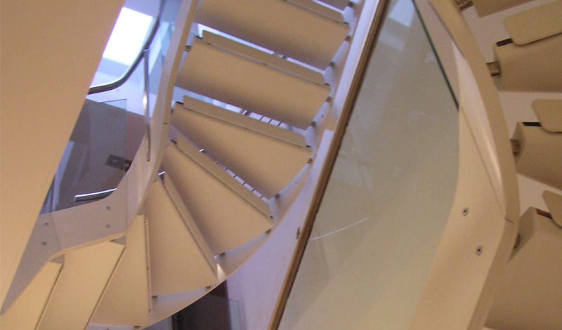 A floating helical staircase for a double storey house. Structure is manufactured in mild steel structure powder coated. Monolithic folded metal trays are inlaid with walnut treads. Balustrade is floating toughened clear glass clamped in a pocket stringer, with stainless steel handrail.