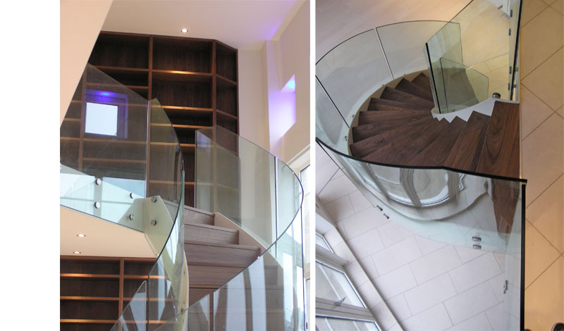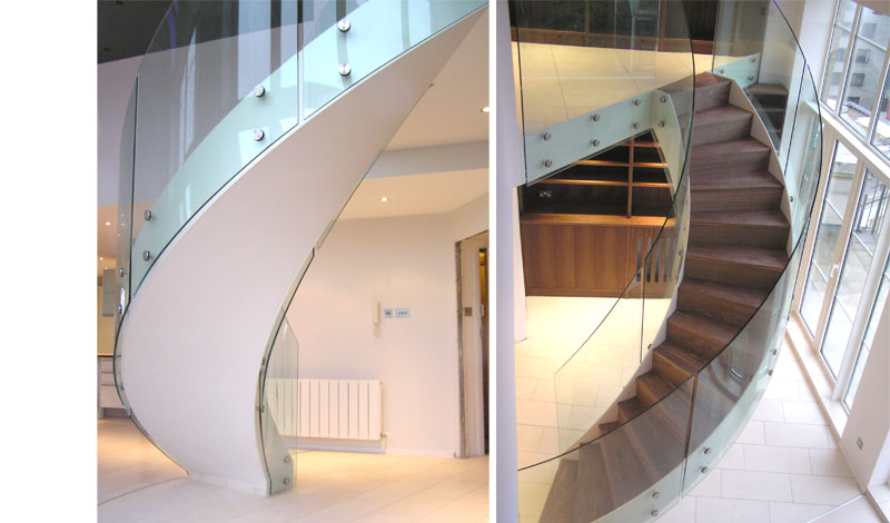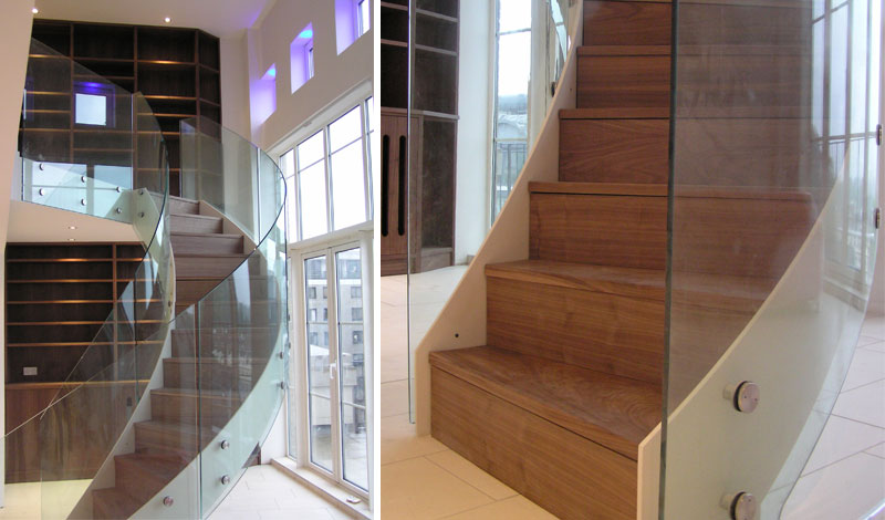 Elegant feature sweeping stairs to penthouse. Stairs is fabricated in mild steel white coated finish with walnut treads and rendered under-soffit. Glass balustrade to stairs and landing is face mounted with stainless steel glass retainers