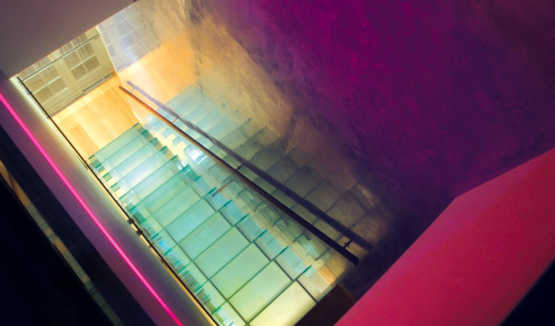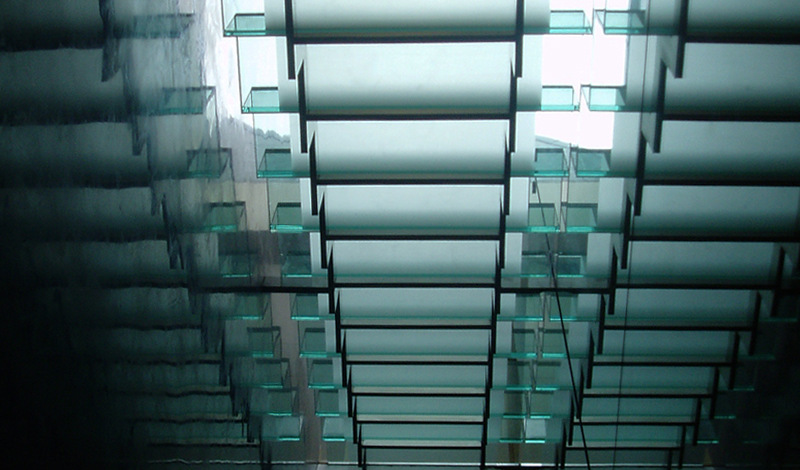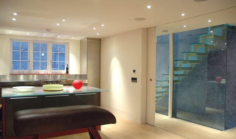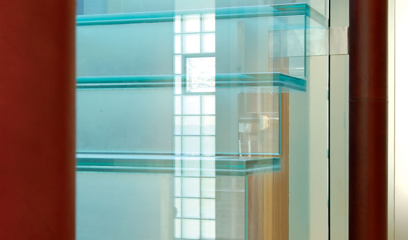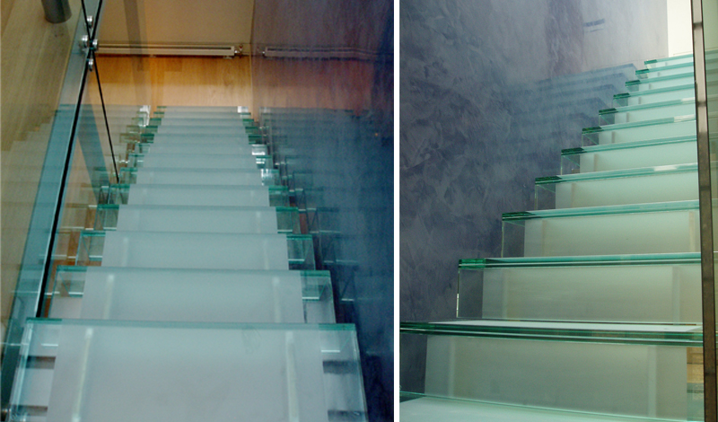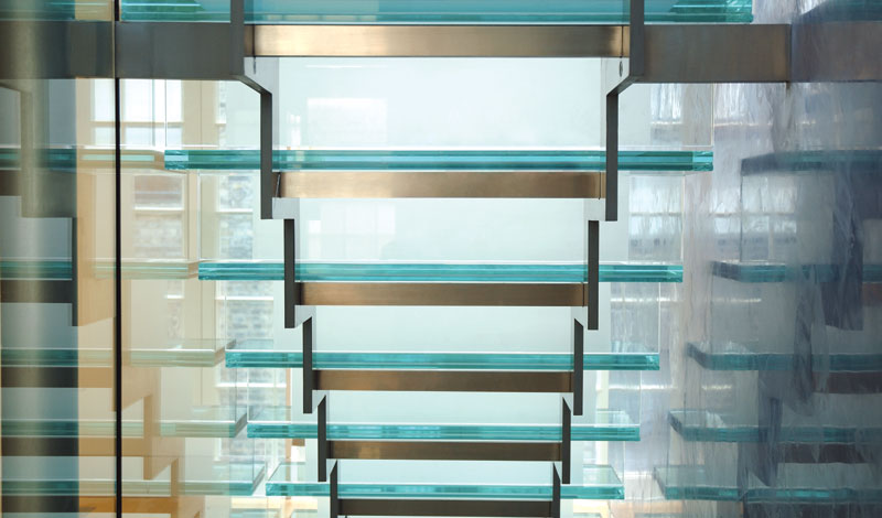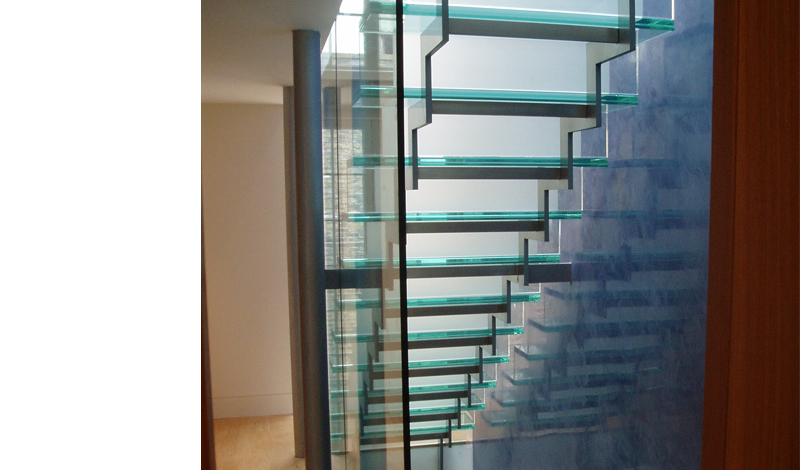 This attractively Glass stairs combines transparency and lightness. The Stairs sit in a two storey mews house light well with an overhead glass skylight. Fabricated in Stainless steel the stairs consist of two offset cut stringer acting as light frame structure for UV bonded glass treads fixed to the frame in a continuous run.