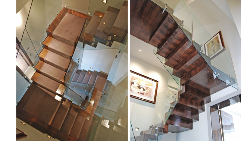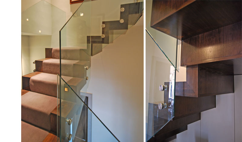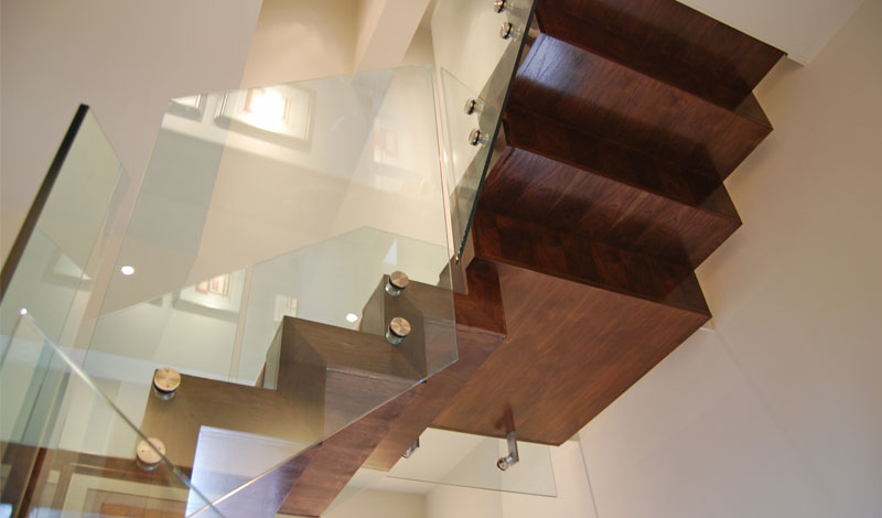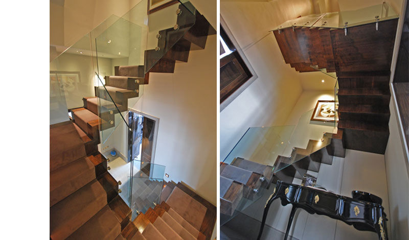 Stairs for a Mansion block conversion from First to Third floor duplex. The stairs is cantilevered and consist of 5 runs climbing over 360 degrees turn. Structure is constructed of a steel zigzag stringer profile fully clad in Walnuts. Glass balustrade to stairs and landing is toughened glass face mounted with stainless glass retainers.