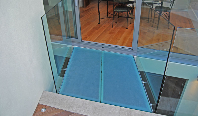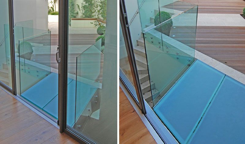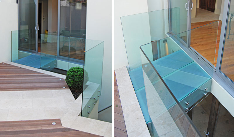 Metal frame construction powder coated finish. Floor is laminated glass panel with frosted finish including 15mm structural glass balustrade.