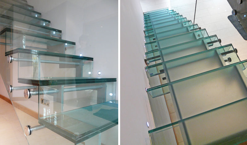 This attractively Glass stairs combines transparency and lightness to a reception hall. Fabricated in Stainless steel the stairs consist of two offset cut stringers acting as a light frame structure for UV bonded glass treads and risers fixed to the frame in a continuous run. Glass balustrade is side mounted with associated stainless steel support fixings to provide transparency and luminosity.